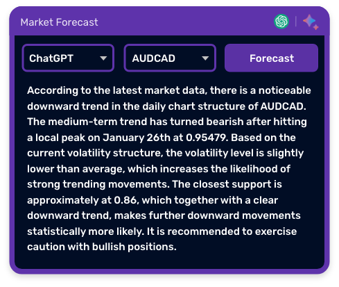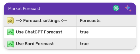 With Perceptrader AI you can take advantage of ChatGPT & Google's Bard, having the possibility to receive weekly market forecasts from these language models and filter trades according to them: